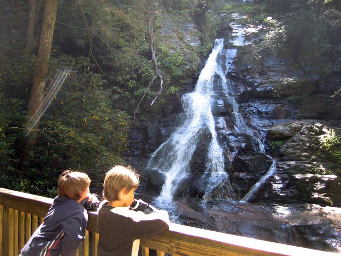 This falls along with Blue Hole Falls is located on High Shoals Creek in Towns County. Hike down a steep path to get to High Shoals Creek walk about a mile down stream through deep woods, and walk bridges crossing small rushing creeks. The first observation platform. is Blue Hole Falls. The trail continues to High Shoals Creek Falls as you approach to falls, the incline becomes steeper. The State Park has installed wooden steps to make the climb easier. This has also protected the under story that grows from the rocks. The climb for this short stretch can be rated as strenuous>but our 3 year old had no trouble with the walk, soon you'll come to the second observation platform. From high up the mountainside, High Shoals Creek shoots out of the laurel and hemlocks as a 50' long cascade that drops into a 40' fall down the rock face.