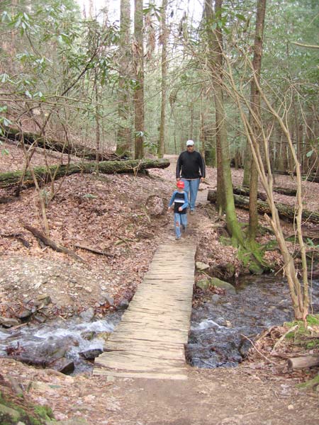 We have always put off doing this trail because of the length and the age of our kids but after walking it the spring of 2008, I can say we should have done it a long time ago. It is a long hike, I think more like 3 miles instead of the suggested 2.5. It took us an hour of steady hiking without stops to reach the end and we are hardy hikers. The trail is easy in most parts but there are a few treacherous spots with steep drop offs into the falls if you are not sure footed. Even those unsteady can easily pass these areas with a helping hand and really there were only two spots we had to watch carefully with our kids. There are only 3 small hills to climb along the trail and not too steep, other than that the trail is easy, very flat and very beautiful. If you can walk 5 miles with ease this hike is well worth it. Allow your self at least 3 and a half hours for the full trip and that should allow you a half an hour stop at the falls. As always wear good shoes and bring drinking water and a sweater, as the whole hike is under the trees and cool even on the hottest summer day.